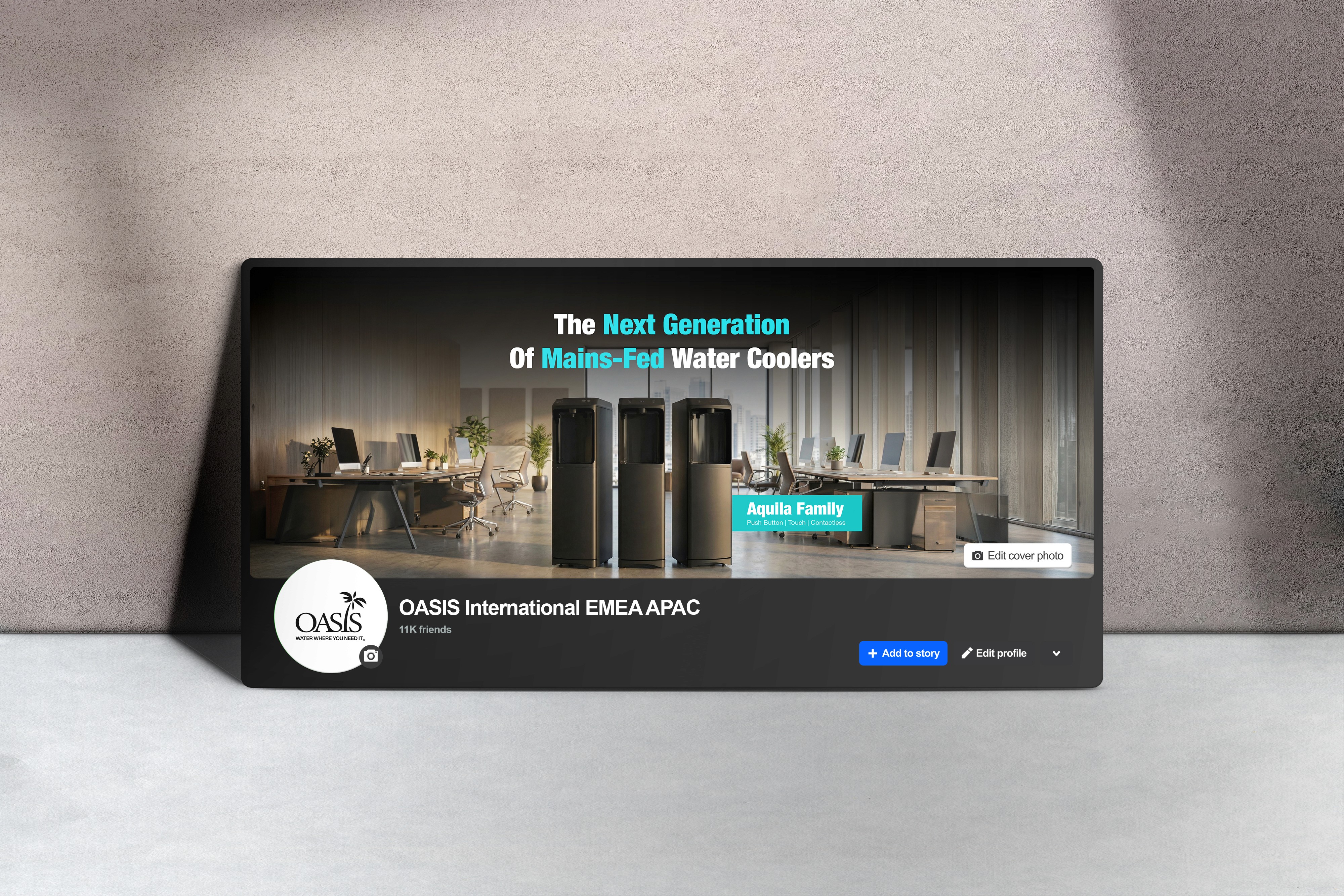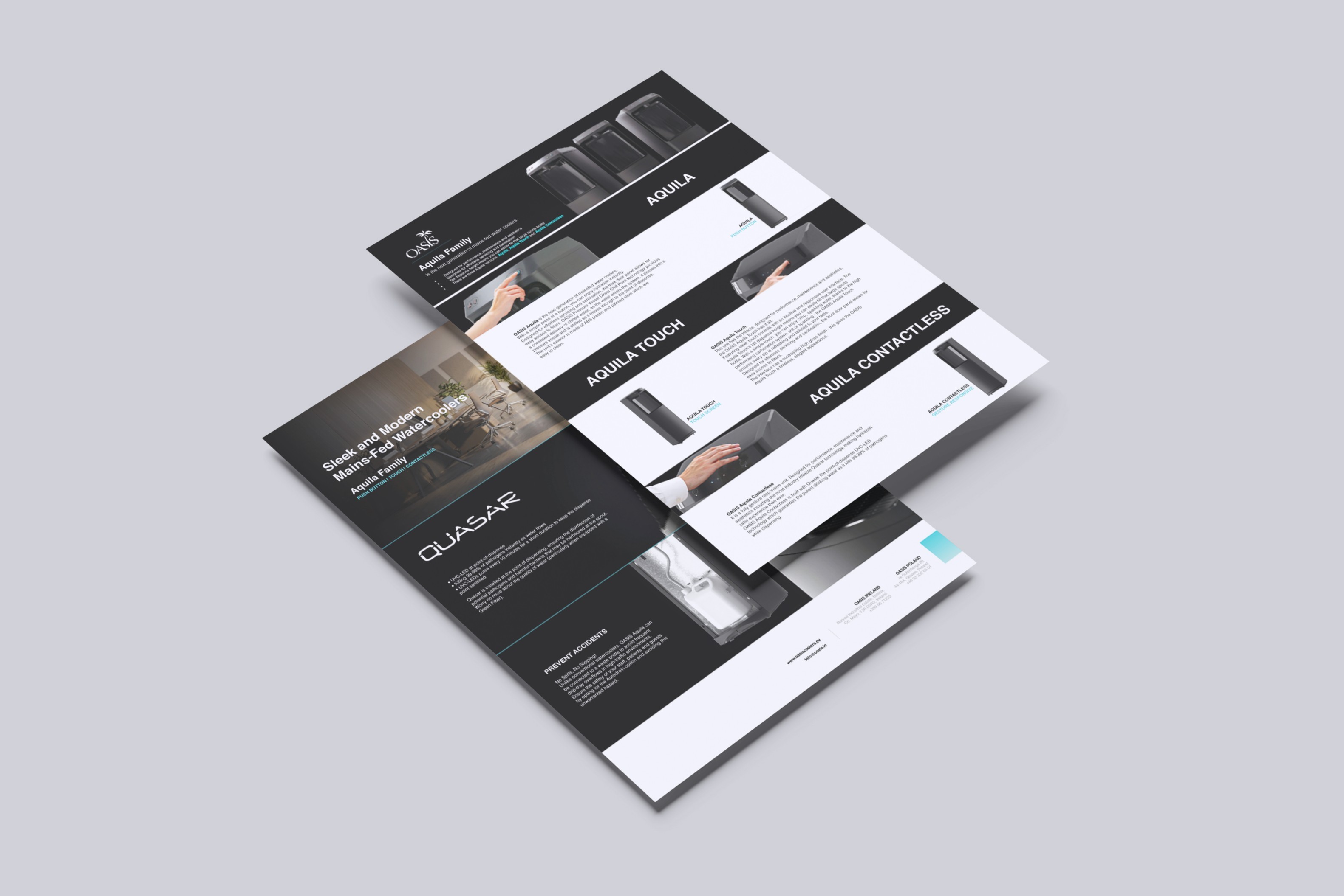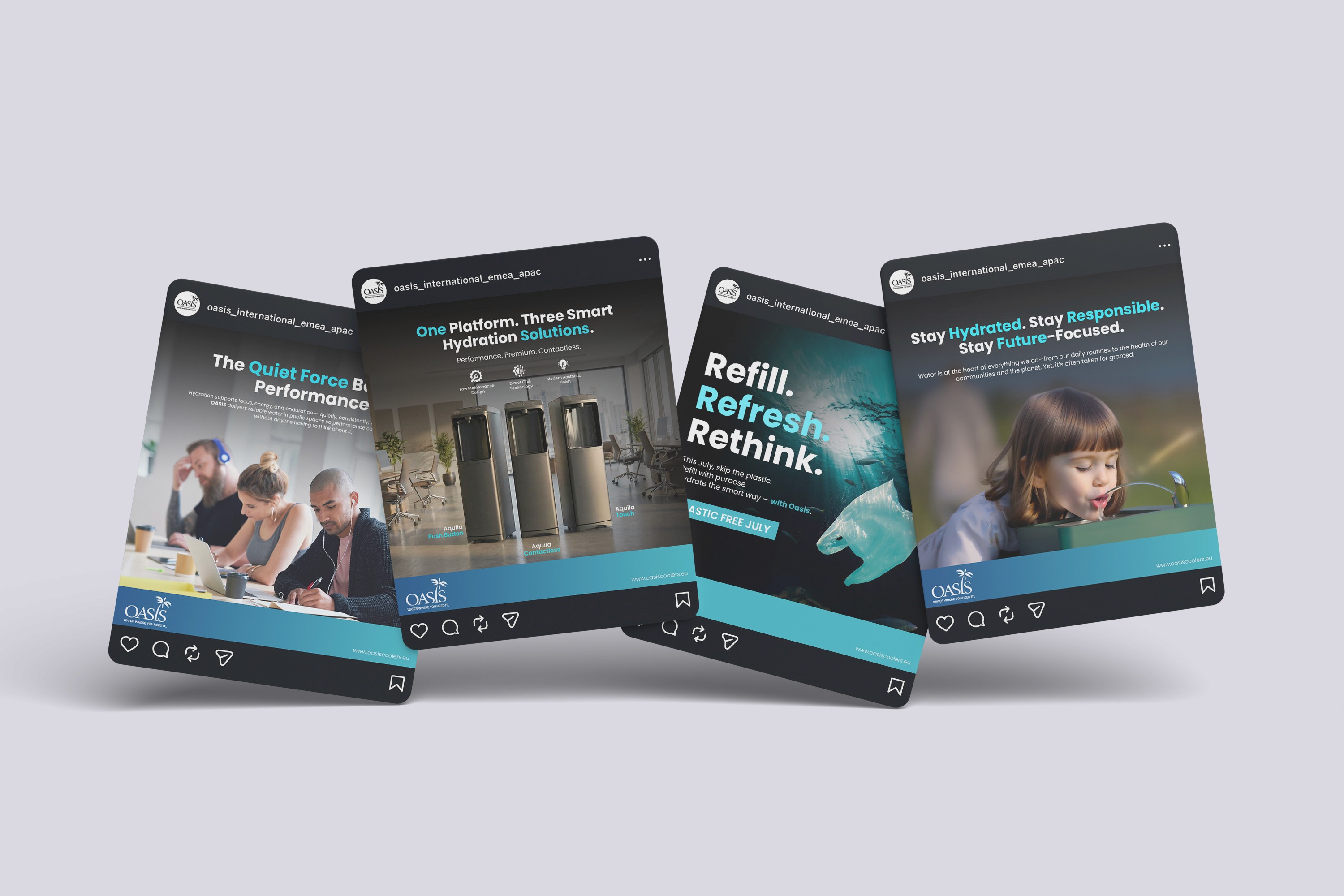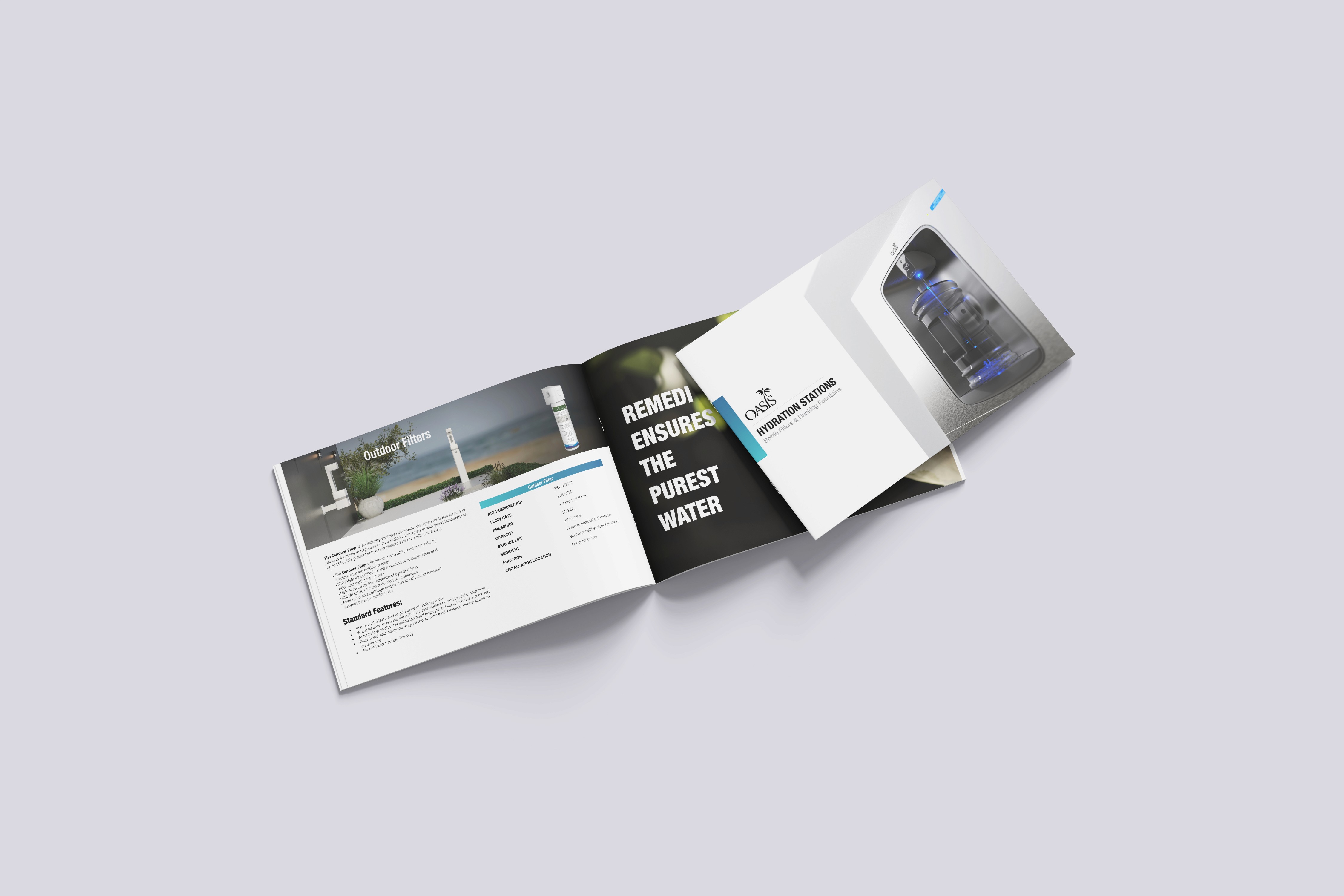 Oasis International operates in the global hydration and water dispensing industry, serving institutional, commercial, and public infrastructure markets. The challenge was to create a cohesive visual communication system that could support both technical product depth and international brand credibility.